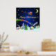 Schöne Schneeflocken mit Weihnachtsbäumen, Häusern, einem Schneemann und einem Regenbogen über dem Schnee, der vom Himmel fällt. Der Weihnachtsmann fliegt am Weihnachtsabend über den Halbmond.