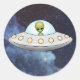 Dieses Design zeichnet sich durch eine freundliche, kleine, grüne Alien in seinem fliegenden Untertasse vor dem Hintergrund von Sternen aus. Perfekt für jeden Scalfreund! Niedlich, weltraumorientiert, die Aufkleber bringen sicher viel Lächeln!