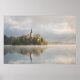 Plakatdruck eines nebeligen Sonnenaufgangs am Bled Lake mit der Insel mit Kirche und Nebel mit Reflexion im Wasser im ersten Sonnenlicht des Morgens in Slowenien. Eine tolle Dekoration an der Wand!