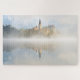 Foto-Puzzle eines nebeligen Sonnenaufgangs am Bled-See mit Reflektion der Insel mit der Kirche im stillen Wasser des Sees und mit Bled Castle im Hintergrund an einem schönen Herbsttag in Slowenien.