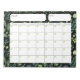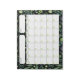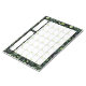 Dieser Notizblock-Kalender enthält ein schwarz-weißes Kalenderraster über grünem Blattwerk. Die Hintergrundfarbe kann angepasst werden. Die Schriftart und Texte können auch angepasst werden, sowie die Felder mit dem Monat und den Anmerkungen und die kleinen grünen Felder für die Tagesnummern. Es gibt genug Seiten für 40 Monate.