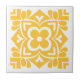A striking yellow and white tile featuring a symmetrical floral motif framed by bold geometric shapes. At the center, a four-petal bloom anchors the design, surrounded by angular curves, teardrop accents, and mirrored heart-like forms. The high-contrast palette and rhythmic layout evoke both mid-century modern and folk-art sensibilities, creating a timeless visual emblem with sculptural clarity and ornamental depth.