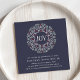 Invitations amis à votre maison de vacances, cocktail de Noël ou dîner avec notre invitation richement colorée et festive. La carte bleue de minuit présente une illustration de couronnes de style art folklorique en ivoire, vert sauge et rouge canneberge avec "JOY" inscrit à l'intérieur. Personnalisez avec les détails de votre fête de vacances sous.