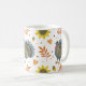 Blaugraue Puten, goldene Sonnenblumen und Eichen, orangefarbene Herzen und Blätter vor weißem Hintergrund