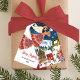 Schreib deine Geschenke stilvoll für deine Freunde und Familie in dieser Ferienzeit. Eine fröhliche Weihnachtsillustrierung mit einem Weihnachtsengel Weltfrieden mit einer weißen Taube. Sie fliegt über einem winterlichen Bergdorf mit farbigen Häusern, Weihnachtsbäumen und Tieren, die im Schnee herumrennen, Schneeflocken wirbeln herunter. Auf der Rückseite können Sie eine persönliche Nachricht und Ihren personalisierten Namen schreiben. Handgemalte Originalwerke von Caroline Bonne Müller