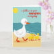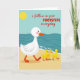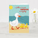 Diese Karte zeigt eine friedliche Szene am Strand, in der ein großes weißes Wassergeflügel mit rosigen Wangen, orangefarbenem Schnabel und orangefarbenen Schwimmhäuten von links nach rechts über den warmen goldenen Sand läuft. Direkt dahinter folgen drei kleine gelbe Küken in einer geraden Linie, die sich mit einer liebevollen, vertrauensvollen Nähe an den Führer anlehnen ❤️. Oben links steht eine runde gelbe Sonne vor einem sanften blauen Himmel, der in einen tiefen Teal-Ozean übergeht. Entlang der Küstenlinie rollen einfache Wellenformen mit dünnen weißen Schaumspuren herein und geben dem Wasser einen sanften, gleichmäßigen Rhythmus. Quer über die Mitte steht in roter Schrift „i follow in your FOOTSTEPS everyday“, wobei „FOOTSTEPS“ in Großbuchstaben und der Rest in Kleinbuchstaben geschrieben ist, um einen Kontrast zu schaffen. Der Text