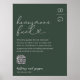 Célébrez votre bonheur à jamais avec style grâce à cette affiche unique de fonds de lune de miel mariage. Présentant un arrière - plan vert luxuriant avec votre monogramme, l'affiche est vraiment l'une des meilleures et parfait pour tout mariage moderne. Pour faciliter le don à vos invités, l'affiche comprend également un code QR pratique. Les clients ont simplement besoin de scanner votre code pour contribuer immédiatement à votre fonds de lune de miel. Cette affiche unique rendra simple pour vos invités de vous donner le don de recharger après votre grande journée. Après des mois de planification et de préparation pour votre grand jour, une escapade bien méritée est la façon parfaite de profiter du début du reste de votre vie ensemble. Avec cette affiche, vous pouvez facilement faire de votre lune de miel de rêve une réalité.
