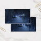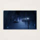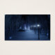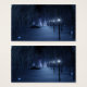 Ein schneebedeckter Weg, der sich in einer dunklen Winternacht durch den Birkenwald schlängelt. Der Weg ist von Laternenpfählen gesäumt, die ein silberblaues Glühen verleihen, aber im Schatten sind die Formen, wie kleine Lichter aus Märchen, hell und verleihen dem Reisenden den Weg. In der Ferne leuchtet der Lavendel einer geheimnisvollen Ansammlung des Waldes den kalten Himmel.