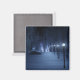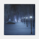 Ein schneebedeckter Weg, der sich in einer dunklen Winternacht durch den Birkenwald schlängelt. Der Weg ist von Laternenpfählen gesäumt, die ein silberblaues Glühen verleihen, aber im Schatten sind die Formen, wie kleine Lichter aus Märchen, hell und verleihen dem Reisenden den Weg. In der Ferne leuchtet der Lavendel einer geheimnisvollen Ansammlung des Waldes den kalten Himmel.