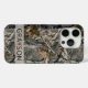 Customize this forest branches camouflage iPhone 15 pro case with your name in a trendy modern CAP font in gray on opaque cream. It's masculine and perfect for your favorite military, hunting, country or outdoorsman!