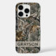 Customize this forest branches camouflage iPhone 16 pro case with your name in a trendy modern CAP font in gray on opaque cream. It's masculine and perfect for your favorite military, hunting, country or outdoorsman!