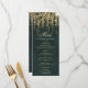 Un menu mariage classique élégant et moderne, avec une aquarelle fantaisie illustrant le feuillage luxuriant et les vignes superposées numériquement d'or sur vert émeraude, pétillant de lumières féériques et de poussière magique : un thème de forêt enchanté. Une carte à la carte élégante et moderne pour un mariage de conte de fées. Parfait pour les mariées qui aiment le cadre de la forêt de contes de fées, la forêt de fées ou le thème du jardin de fées et vert émeraude.
