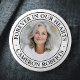 Button featuring a photo and custom text "forever in our hearts" and name in an elegant serif font on a white background.