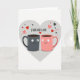 This design shows two cute anthropomorphic mugs standing close together, one in dark grey and the other in blush pink, leaning in like close friends or sweethearts 🥰. Their wide white eyes and small, upturned smiles face forward, giving the scene a gentle, happy energy that reads as affectionate without trying too hard. A large muted-grey heart outline sits behind them like a soft frame, wrapping the pair in a quiet, cozy embrace ❤️. Near the top, the words “FOREVER LOVE” are placed above the mugs in dark grey, easy-to-read letters that balance the illustration. Around the couple and the headline, small hearts drift and scatter in red, light pink, and dark grey, adding motion and a light romantic sparkle. The background stays simple with soft pastel tones and subtle shading, keeping attention on the mugs and the heart shapes. The overall layout centers the mugs inside the big heart, with the smaller hearts sprinkled mostly around the upper half and sides. The dark grey mug sits on the left and the pink mug on the right, with tiny hearts floating around them and the headline at the top.