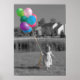 Nostalgisches Bild eines kleinen Mädchens, das im Spiel mit einem Ballonbukett läuft. Schwarz und Weiß mit selektiver Färbung.