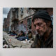 A group of homeless individuals is seen sitting on a street in front of a dilapidated building. Graffiti and litter indicate a neglected urban area under gloomy weather.