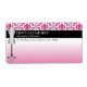 Ein graues Kleid steht auf einer leuchtend rosa reflektierenden Oberfläche auf diesem magenta Damask gemusterten Versandschild. Ein persönlicher oder geschäftlicher Name zeichnet sich durch das schwarze Band mit einer Rücksendeadresse unten aus. Ideal für Modedesigner, Schneider, Schneider oder auch für diejenigen, die in den Modebereich einbrechen. Verfügbar mit passenden Produkten.com.