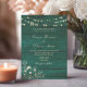 Ankündigen Sie Ihre Hochzeit mit einer eleganten, modernen Einladung. Dieses rustikale smaragdgrüne Design zeichnet sich durch boho goldene Blumenspitzen, Lichter an der Zeichenkette und einfache Kalligraphie-Skripte aus.