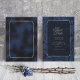 Elegante Hochzeitskarte Save the Date in einem formaleren Stil mit einem klassischen Layout aus goldenen Rahmen und Text mit einem verzierten Paisley-Rahmen. Dieses Beispiel fügt eine moderne Touch mit seinem Hintergrund in schimmerndem Marineblau hinzu. Fügen Sie Ihre Veranstaltungsdetails in einem Serif-Schriftart hinzu, um die typische Anziehungskraft des Events zu erhalten. Suchen Sie ID767, um andere Farboptionen für dieses Design zu sehen.