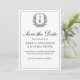 Die Essenz der Eleganz mit einem formalen Wappen-Monogramm-Blumenmuster Save the Date Hochzeitsdesign. Diese elegante Mischung aus zeitlosen Blumenmotiven und einem personalisierten Monogramm-Wappen verleiht Ihrem Hochzeitsdekor und Ihrer Schreibwaren eine Touch Eleganz. Das Design ist ideal für Paare, die einen klassischen und dennoch eleganten Stil suchen, und verleiht dem Ganzen eine Atmosphäre von Anmut und Luxus. Ideal für feierliche Hochzeiten, wird diese kohäsive und zarte Ästhetik einen bleibenden Eindruck verlassen, der die Schönheit und Wichtigkeit Ihres besonderen Tages widerspiegelt.