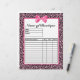 Mit diesen niedlichen und trendigen, rosa und schwarz leopardenfarbenen Boutiquen-Bestellformularen, die in einem niedlichen Bogen mit einem gürtlich rosa Band-Design verziert sind, können Sie Ihre Bestellung ganz einfach machen. Personalisieren Sie diese, indem Sie den Namen Ihres Ladens oder Online-Shops hinzufügen. Diese stilvollen Vorlagen des Bestellformulars haben Platz für eine Produktbeschreibung, Menge und Verkaufspreis. Flachbild, nicht echtes Band.
