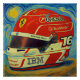This painting depicts a vibrant red and white racing helmet with sponsor logos, set against a dramatically swirling blue and yellow background in a textured, expressive style reminiscent of Van Gogh.