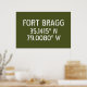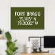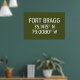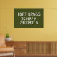 Längen- und Breitengradkoordinaten für Fort Bragg, in der Nähe von Fayetteville, weißer Schriftart im Stil von North Carolina Stencil auf army-grünem Hintergrund.
