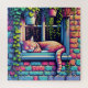 Ai Art zeigt eine schläfrige Katze auf einem Fenstersill, umgeben von hängenden Pflanze und Ziegelmauer. Niedliche Kunst für Pflanze- oder Katzenliebhaber.