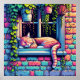 Ai Art zeigt eine schläfrige Katze auf einem Fenstersill, umgeben von hängenden Pflanze und Ziegelmauer. Niedliche Kunst für Pflanze- oder Katzenliebhaber.