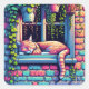 Ai Art zeigt eine schläfrige Katze auf einem Fenstersill, umgeben von hängenden Pflanze und Ziegelmauer. Niedliche Kunst für Pflanze- oder Katzenliebhaber.