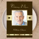 Diese 75. Geburtstagsfeier in Braun mit goldenen Akzenten zeigt Ihr Foto in der Mitte, zusammen mit einem Ort, an dem Sie den Namen der Geburtstagsehre unter das Foto stellen können. Eine sehr elegante und persönliche Art, Gäste zu einer 75. Geburtstagsfeier einzuladen. Copyright henishouseuse paper