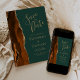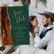 Diese elegante, moderne Save the Date-Karte verfügt über eine verbrannte, orange Aquarellfarbe, die mit Imitaten vergoldetem Glitzer bespannt wurde. Der goldfarbene Text erscheint auf einem dunkelgrünen Hintergrund. Ersetzen Sie das Beispielbild auf der Rückseite einfach durch Ihr bevorzugtes vertikales Foto.