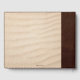 Ein Gästebuch mit individuellem Foto, gerahmt von einem dunkelbraunen Imitat mit Leder und Sand-Stilelementen.