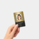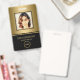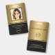 Modernes Foto-Geschäft mit Foto auf goldenem Hintergrund und Logo. Zusätzliche Informationen können auf der Rückseite dieses Business-ID-Abzeichens hinzugefügt werden