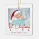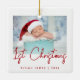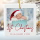 Feiern Sie mit diesem modernen minimalistischen Foto-Sake-Ornament das erste Weihnachtsfest des Babys. Der rote Text lautet "1. Weihnachten" in angesagter Handschrift. Ersetzen Sie das Beispielbild einfach durch Ihr Lieblings-Foto, und fügen Sie den Namen des Babys und das unten stehende Jahr hinzu. Ein Bildschirm mit weißem Farbverlauf ermöglicht den Pop des Textüberlagers.