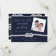 Dieser einfache Foto-Strand verfügt Save the Date über Ihre eigenen Foto- und Segel-Seile mit Ihren Namen und den Worten "Binden den Knoten" mit klassischer Typografie auf marineblau Hintergrund, und Ihre Hochzeitswebsite auf der Rückseite. Save the Date und perfekt für Wassersport, Küste, Segeln, Hochzeiten auf dem Schiff oder Hochzeiten am Strand. Es ist einfach, minimalistisch, elegant und modern. Einfach mit Ihren eigenen Hochzeitsinformationen personalisiert.