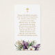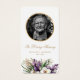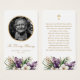 Elegante lila und weiße Begräbungs-/Gedenkkarten/Gebetskarten mit goldfarbenem Foto mit violetten Blumen, weißen Orchideen und Grünpflanzen auf der Vorderseite und einem goldenen Kreuz mit einer blumengeschmückten Anordnung auf der Rückseite.