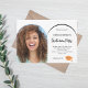 Fügen Sie Ihr eigenes Foto in vertikaler Größe des Absolventen hinzu. Ein bogenförmiger Rahmen aus Foto. Eine schicke, weiße Hintergrundfarbe. Personalisieren und fügen Sie einen Namen und Party-Details hinzu.