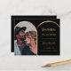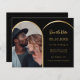 Ein Foto Save the Date für Ihre Hochzeit. vorne: Fügen Sie Ihr eigenes Foto in vertikaler Größe hinzu. Ein Imitat vergoldetes Foto Bogen Rahmen. Klassischer schwarzer Hintergrund, goldener Text. Personalisieren Sie Ihre Namen und das Datum und fügen Sie sie hinzu. 1 Blatt = 1 Save the Date bedruckte Kante bis Kante.