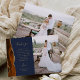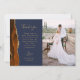 Schicken Sie Ihrer Familie und Ihren Freunden einen besonderen Hochzeitsdanken mit diesen maßgeschneiderten Fotokarten. Auf der links erscheinen die Worte "danke" in eleganter goldfarbener Schrift Typografie auf marineblau Hintergrund über eine kurze, bearbeitbare Botschaft des Dankes an Ihre Hochzeitsgäste in Copperplate Schriftart, mit Ihren Namen unten. Ein verbrannter orangefarbener Wasserfarbenstreifen, der mit Imitaten bestickt ist, verziert den links Glitzer. Die Rückseite bietet Platz für ein zweites, horizontales Foto.