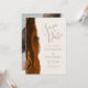 Diese elegante, moderne Save the Date-Karte verfügt über eine verbrannte, orange Aquarellfarbe, die mit Imitaten vergoldetem Glitzer bespannt wurde. Der goldfarbene Text erscheint auf einem Elfenbeinhintergrund. Ersetzen Sie das Beispielbild auf der Rückseite einfach durch ein vertikales Foto der zukünftigen Braut und des Bräutigams.