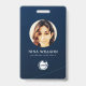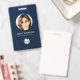Moderne Foto Business ID Karte mit Strichcode über dunkelblauem Hintergrund. Zusätzliche Informationen können auf der Rückseite dieses Business-ID-Abzeichens hinzugefügt werden