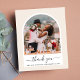 Eine preisgünstige und elegante Hochzeit dankt Ihnen für die Neuvermählten, die Ihr Foto in einem gewölbten Bilderrahmen vor cremefarbenem Hintergrund zeigen, "danke" in einem stilvollen, modernen Drehbuch und Ihren Mr. & Mrs. Auf der anderen Seite können Sie eine Danksagung personalisieren und Ihre Vornamen als Unterschrift hinzufügen, wobei der Raum oben steht, um den Empfänger auf Wunsch persönlich anzusprechen.