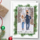 Moderne elegante Watercolor Green Pine Frame mit Pine Cones Family Foto Frohe Weihnachtskarte