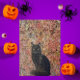 Foto der schwarzen Katze mit Orangen Herbstblätter