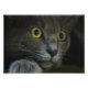 Eine nah-up-Aufnahme des Gesichts einer grauen Katze mit gelben Augen und verdünnten Schülern, die den Kopf auf der Pfote ruht und etwas hinter der Kamera scharf starrt.