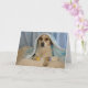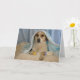 Humorvolle Grußkarte für neues Baby. Foto eines Hundes, der als Babyjunge, mit Flasche und Schnuller aufwirft. Glückwünsche!