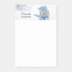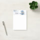 Sticky Noten mit einem niedlichen Foto eines kleinen Schneemanns. Stehend im Winter mit Schneefall. Dieser niedliche kleine Typ ist in blau gestricktem Hut und Schal gekleidet.