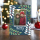 Eine moderne frohe Weihnachtskarte in Marine, grün, rot und weiß. Das moderne, abstrakte Design umfasst Eukalyptuszweige, Beeren und Sans Serif für den Hauptteil des Textes. Der Gruß ist in einer rustikalen modernen Schrift. Auf der Rückseite befindet sich ein Eukalyptusmuster in Grüntöne und Weiß.