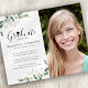 Laden Sie Freunde und Familie ein, um mit dem Abitur zu feiern, mit dieser modernen Abschluss-Einladung mit Aquarell Eukalyptus-Blätter. Das Foto dient zur Veranschaulichung und kann in ein eigenes umgewandelt werden.
